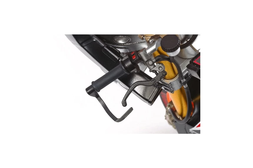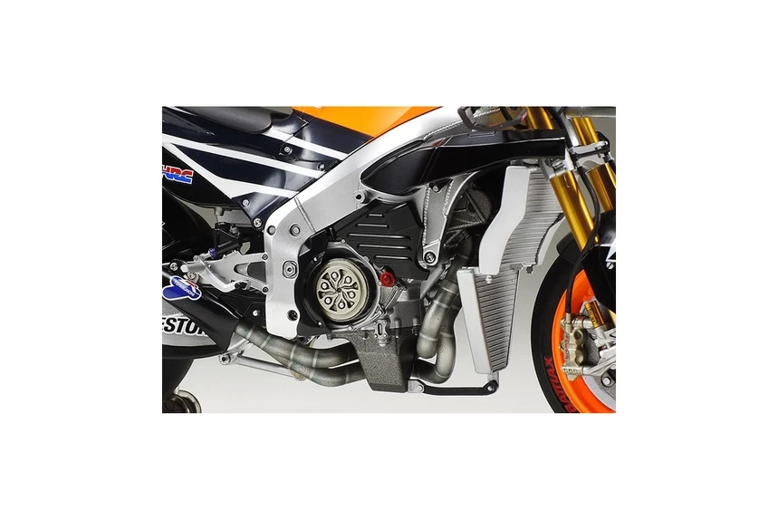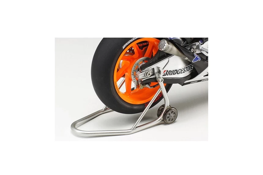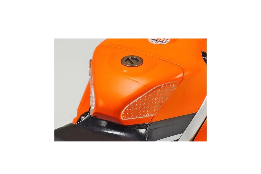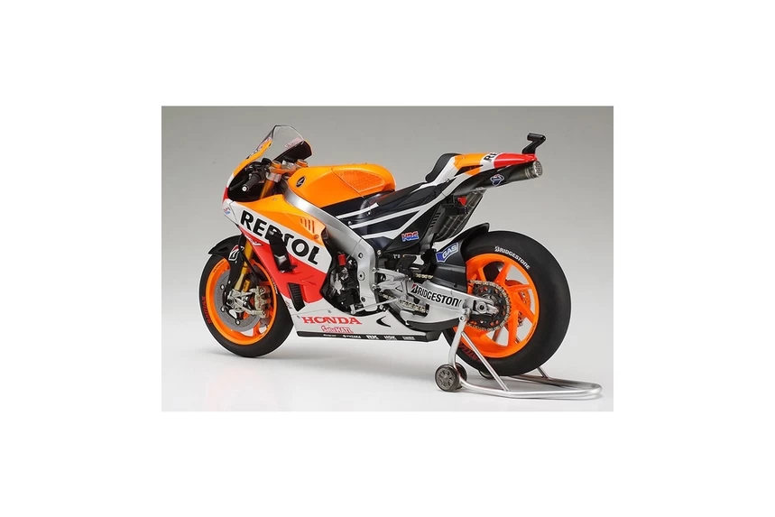 ★This is a 1/12 scale plastic model assembly kit. ★Length: 173mm, width: 58mm. ★The kit recreates Marc Marquez’ 2014 champion No.93 bike with glorious accuracy. ★Cowl parts may even be removed after assembly to allow closer appreciation of the jaw-dropping detail underneath. ★Clear windscreen parts are attached without the need of cement. ★Tank grips are also depicted using transparent parts. ★Minute screws are used to firmly fasten parts such as the engine, swing arm and front fork to the frame. ★Marvel at the recreation of the bike’s V4 powerplant, complete with depictions of auxiliary equipment. ★Tail cowling part features a rendering of the camera. ★Decals are included to recreate logos on the sidewalls of the realistic solid rubber tires. ★Comes with a comprehensive set of screen printed decals to depict the numerous sponsor logos, instrumentation panel, etc. ★ Packaged with a racing stand in box.
