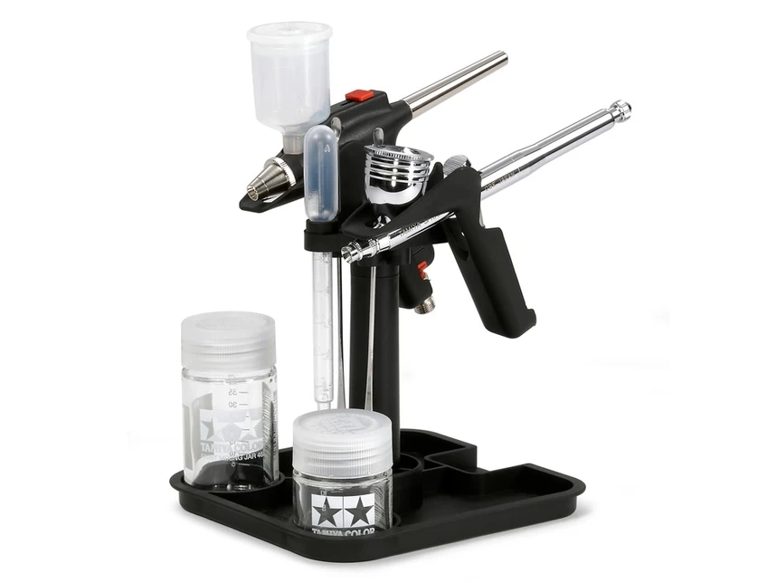 This airbrush stand will greatly help you with painting at your work area. This stand consists of a tray-type base and two airbrush hangers which enable placement of two airbrushes at the same time and is compatible with all Tamiya airbrushes except for Tamiya Badger airbrushes. In addition, spare bottles can be placed onto the base and stirrer sticks can be attached to the stay. Long pipette is also included.