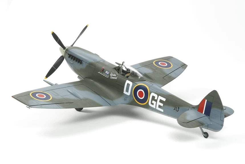 1/32 scale plastic assembly kit of the Spitfire Mk.XVIe. ★Overall Length: 302mm, Overall Width: 311mm. ★Distinctive features of the Mk.XVIe, including Packard Merlin 266 engine, E Type wing, teardrop canopy, and modified landing gear legs, are accurately reproduced. ★Canopy may be opened even after assembly. ★Features movable ailerons, rudder, and elevators. Flaps can be depicted in either up or down position. ★30 gallon drop tank, two 250lb bombs, and 3 types of markings included. ★Comes with 3 kinds of markings to depict the aircraft from Royal Air Force squadrons as well as the (Pilots) Refresher Flying Unit. ★2 pilot figures, 1 seated and 1 standing, are included.