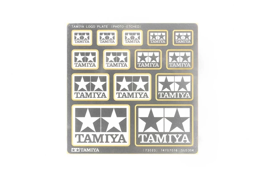 Let the world know where your modeling loyalties lie with this sheet of photo-etched Tamiya logo plates for use on your display bases or models!