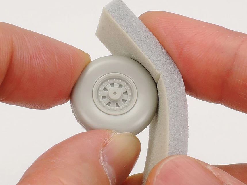Attached to a flexible sponge base, the abrasive coat of this sanding sheet is well-suited for removing protrusions on plastic models and also finishing materials such as wood and metal. The sponge’s flexibility allows even finishing of curved surfaces and hard-to-reach corners. This item can be easily cut into the desired shape/size using a modeling knife. Note: Suitable for wet sanding use.