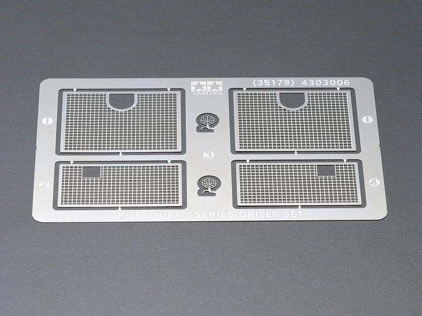 This photo-etched grille set features metal parts to depict the engine air-intakes and exhausts, bullet proofing nets, and sights for the anti-aircraft machine gun for mid and late production Tiger-I and Sturmtiger tank models. The photo-etched metal parts will provide your model with a sharper and a more realistic scale finish.