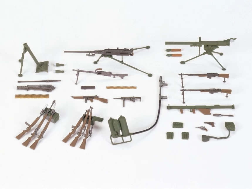 This is a 1/35 scale plastic model assembly kit depicting typical WWII U.S. weaponry. ★A comprehensive set includes various pistols, the M1 rifle, M2 carbine, Thompson submachine gun, M2 heavy machine gun, M2 mortar, bazookas, M18 recoilless rifle and various other subjects. ★Also comes with accessories such as ammo cases, rounds, gas masks and more.
