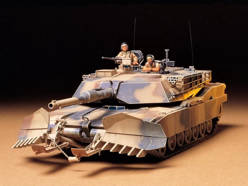 Minefields were a constant hazard for invading U.S. forces during the Persian Gulf War of 1991; chief among their countermeasures was the trusty M1A1 tank fitted with a mine plow. This plastic model assembly kit expertly recreates such an M1A1 Abrams with mine guard and plow blade equipment depicted using separate parts. Metal chains and enamel wire are included, to be employed in the recreation of the roller at the front of the vehicle. Modelers can choose to assemble the model with hatches open or closed, and will be delighted by the range of accessories, including spare wheels, ammo cases and more! The kit comes with a full body commander figure and loader torso figure to further enhance its realism.