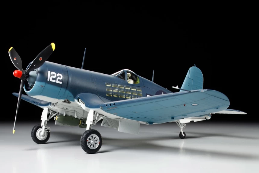 This is a 1/32 scale plastic model assembly kit of the F4U-1A Corsair. Fueslage length: 318mm, wingspan: 390mm. ★Features specific to the F4U-1A such as the semi-bubble canopy, starboard leading edge spoiler and extended tail wheel strut are captured with accuracy. ★The model accurately reflects the new F4U-1A seat position and accompanying changes in the cockpit. ★Assemble with flaps and elevators in up or down position as per your preference. ★2-piece engine cowling can be removed after assembly to allow appreciation of the breathtaking engine recreation. ★Aircraft can be assembled in parked or airborne state. ★3 included marking options recreate U.S. Navy and U.S. Marine Corps units.